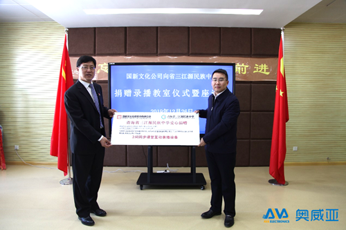 圖為:奧威亞母公司國(guó)新文化向青海省三江源民族中學(xué)捐贈(zèng)同步課堂互動(dòng)錄播設(shè)備的場(chǎng)景