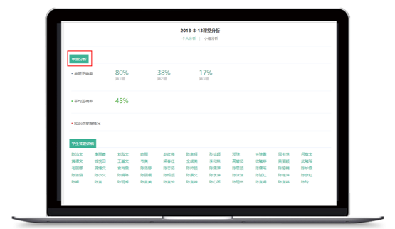 教師可按班級(jí)和日期查看課堂、預(yù)習(xí)、作業(yè)、輔導(dǎo)的統(tǒng)計(jì)分析數(shù)據(jù),還可查看每個(gè)學(xué)生的答題情況。