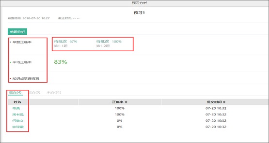 可查看該預(yù)習(xí)任務(wù)各題的正確率、批改情況、平均正確率、知識(shí)點(diǎn)掌握情況和已交、遲交以及未交的學(xué)生信息。