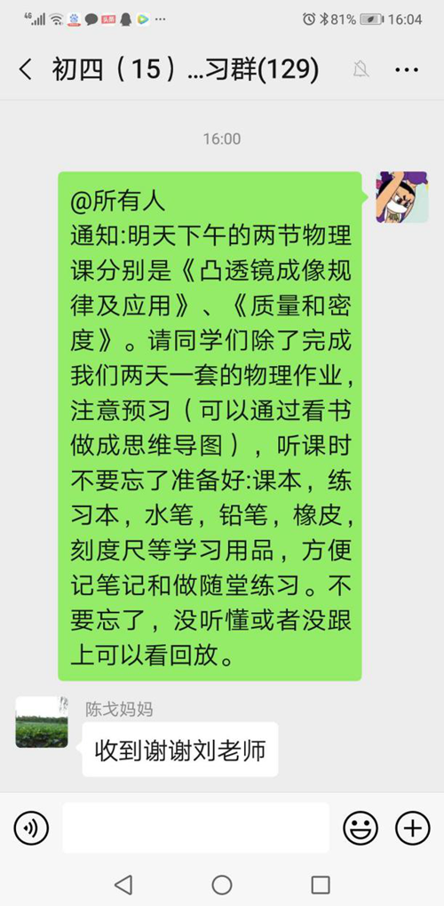 每次物理直播的前一天,我都會(huì)在家長(zhǎng)微信群里發(fā)出這樣的公告,提醒孩子對(duì)要復(fù)習(xí)的章節(jié)預(yù)習(xí),準(zhǔn)備好上課的用具,還有激勵(lì)他們的語(yǔ)言。