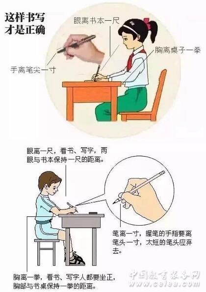 保持正確的讀寫坐姿。牢記“一拳一尺一寸”。眼睛距離書本應為一尺(33-35厘米)、胸前與課桌距離應為一拳(8-10厘米)、握筆時筆桿與紙面的角度在40-50度之間,手指與筆尖距離應約為一寸(約3厘米);