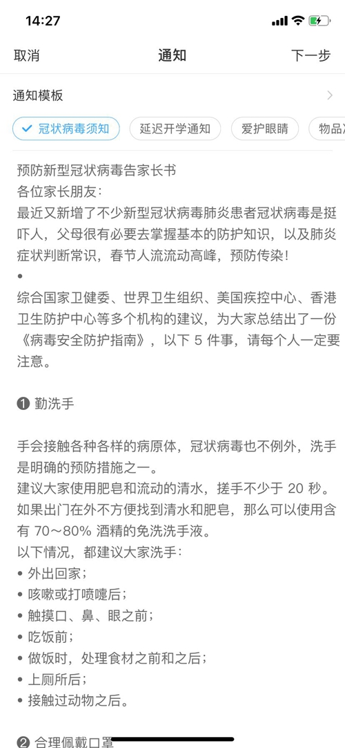 抵御疫情,通知及時性顯得尤為重要。班優(yōu)為老師提供了關(guān)于此次新型肺炎的通知模版,老師只需輕編輯,上傳所需圖片、視頻,就可以向家長、學(xué)生科普疫情知識,傳遞正能量。