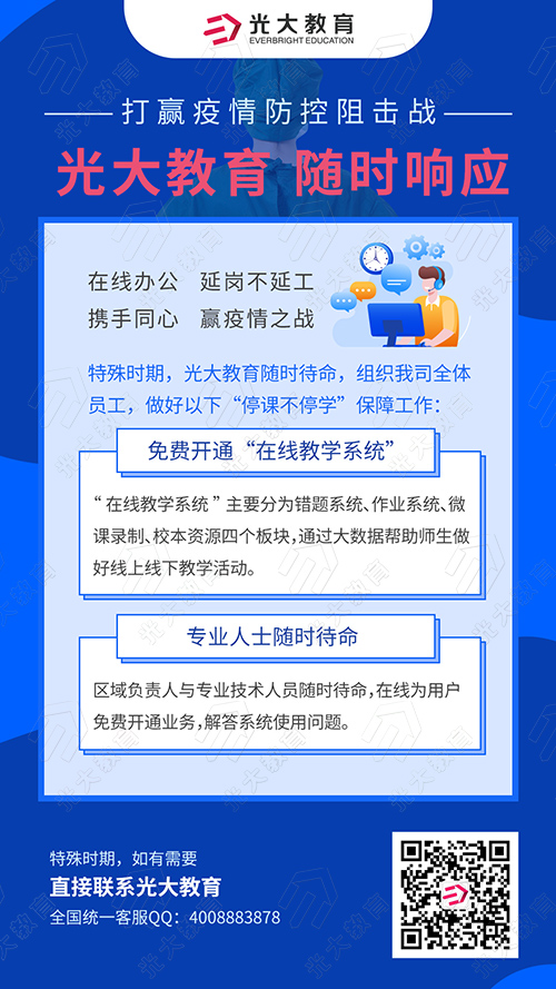 疫情期間,光大教育向有需求的學(xué)校、教師、學(xué)生與家長免費(fèi)提供“在線教學(xué)系統(tǒng)”服務(wù),有相關(guān)需求請直接聯(lián)系我們!