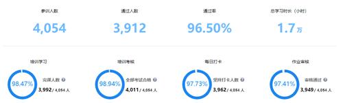 此次培訓(xùn)獲得都安瑤族自治縣教育局高度重視以及全縣老師的積極響應(yīng),據(jù)悉,初階培訓(xùn)參加人數(shù)共計(jì)4,054名。截止至2020年5月21日,初階培訓(xùn)取得圓滿的成功,全縣教師累計(jì)學(xué)習(xí)時(shí)長(zhǎng)共計(jì)1.7萬小時(shí),培訓(xùn)考核通過人數(shù)為3912人,考核成功率96.5%,此次培訓(xùn)達(dá)到預(yù)定目標(biāo),基本實(shí)現(xiàn)老師能夠通過培訓(xùn)掌握交互式課件制作的要求。