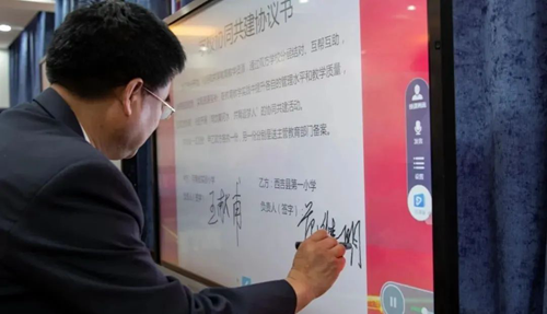 疫情之下,為了盡量避免人群聚集,做好疫情防控工作,并推動此次簽約環(huán)節(jié)能夠順利進行,河南省實驗小學(xué)與寧夏西吉縣第一小學(xué)采用希沃交互智能錄播搭建云端互動環(huán)境,以云上形式順利舉行座談會。通過希沃交互智能錄播設(shè)備和遠程互動助手,河南省實驗小學(xué)的王獻甫校長在一體機進行板書簽字時,一千多公里外的寧夏西吉縣第一小學(xué)的范維明校長也可同步板書,真實還原現(xiàn)場簽約場景。