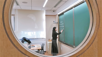 新學(xué)期的第一堂直播課,北京大學(xué)數(shù)學(xué)科學(xué)學(xué)院教師趙玉鳳在教室黑板上書寫數(shù)學(xué)公式。新華社發(fā)
