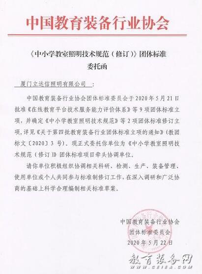 標(biāo)準(zhǔn)由廈門立達(dá)信照明有限公司提出并牽頭制定,中國(guó)教育裝備行業(yè)協(xié)會(huì)歸口,是首個(gè)教育照明行業(yè)團(tuán)體標(biāo)準(zhǔn),今年立達(dá)信牽頭標(biāo)準(zhǔn)修訂工作。