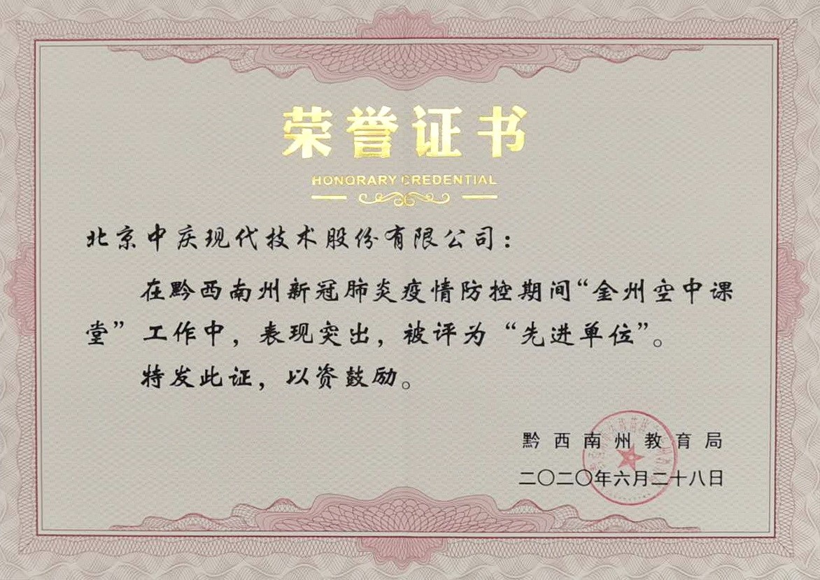 近日,貴州黔西南州教育局對“金州空中課堂”工作中有突出表現(xiàn)的先進單位和個人進行了表彰,現(xiàn)代中慶優(yōu)質(zhì)的服務(wù)得到教育局的認可,與25個市縣教育局和學(xué)校單位一起榮獲先進單位稱號。