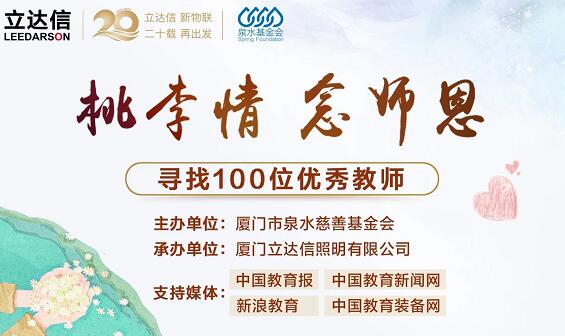 第36個教師節(jié)來臨之際,恰逢立達(dá)信集團(tuán)創(chuàng)立20周年,我們聯(lián)合公益組織廈門市泉水慈善基金會,一起致敬教師。尋找100位優(yōu)秀教師代表,特別是在邊遠(yuǎn)鄉(xiāng)村任教超過20年的教師,表達(dá)我們誠摯的敬意和節(jié)日祝福。
