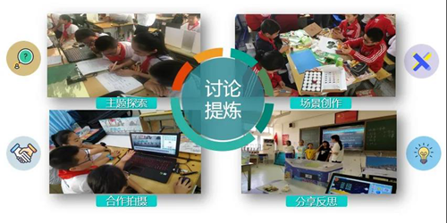 課堂上,學生以小組為單位,創(chuàng)設(shè)復雜、有意義、結(jié)合學生生活實際的問題情境,通過主題探索、場景創(chuàng)作、合作拍攝與分享反思四個環(huán)節(jié)開展項目式學習,培養(yǎng)學生整合運用語文、美術(shù)、音樂、信息技術(shù)和與項目相關(guān)的學科知識與技能,為學校打造多學科融合應用的創(chuàng)新學習模式。