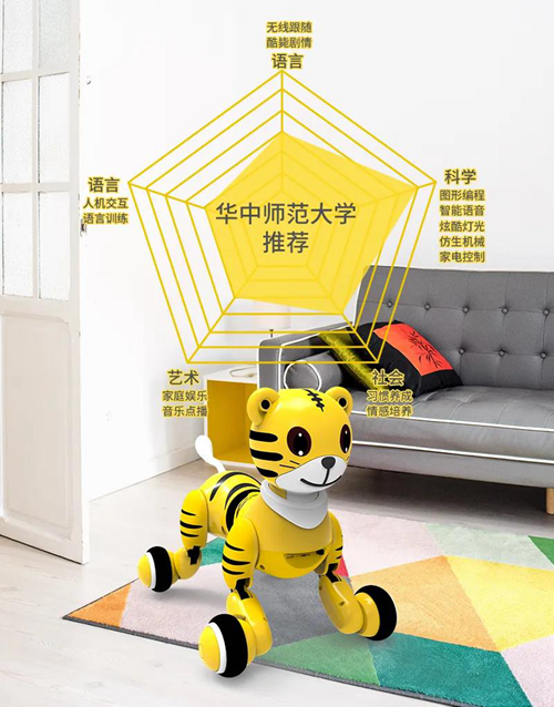 這是一款與華中師范大學(xué)聯(lián)合研發(fā)出品,并獲得教育部專(zhuān)家推薦的可編程可群聊的智能玩教具機(jī)器人。智能機(jī)器虎在教育方面與北京師范大學(xué)聯(lián)合出版機(jī)器虎編程圖書(shū),包含了兒童學(xué)前教育的五大領(lǐng)域,健康、語(yǔ)言、社會(huì)、科學(xué)、藝術(shù)。