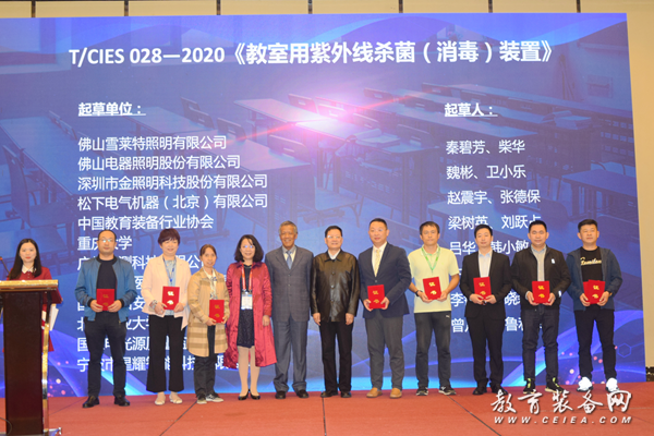 中國照明學會專職副理事長華樹明、中國教育裝備行業(yè)協會副秘書長朱俊英、重慶照明學會理事長楊春宇共同發(fā)布了中國照明學會團體標準T/CIES 028—2020《教室用紫外線殺菌(消毒)裝置》,并為標準參編單位和專家頒發(fā)了證書。
