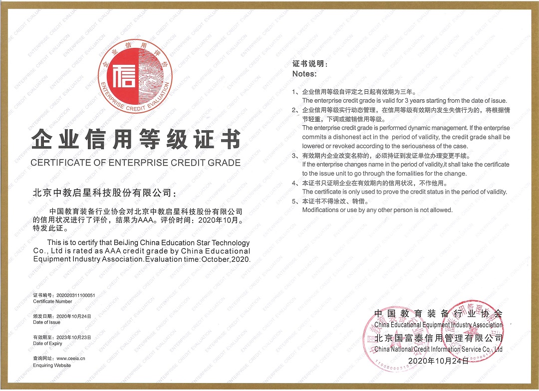 北京中教啟星科技股份有限公司作為最早獲得中國教育裝備行業(yè)協(xié)會AAA企業(yè)信用等級證書的教育裝備企業(yè),再次通過2020年教育裝備企業(yè)信用等級嚴格評審,獲得2020年中國教育裝備行業(yè)AAA企業(yè)信用等級證書。