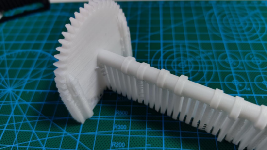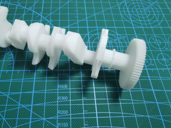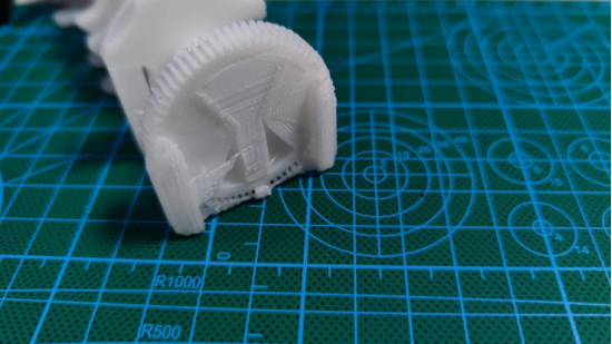 白色耗材為極光爾沃官方PLA耗材,打印的零件表面基本找不出瑕疵,十分光滑,作為運(yùn)動件也不需要在拋光即可使用。通過墊板上的測量尺可以對比出來,第2張圖的小齒輪間隙只有約3mm,然而即使是如此細(xì)小的細(xì)節(jié),A6也將其完美的還原了出來,并沒有出現(xiàn)我們意料中可能出現(xiàn)的變現(xiàn)情況。