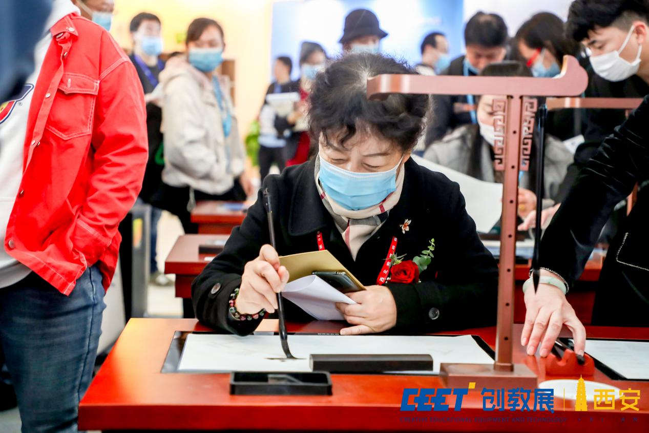 ▲陜西省教育廳教育技術(shù)裝備管理中心主任趙夢(mèng)現(xiàn)場(chǎng)親身感受華文眾合智慧書法教室