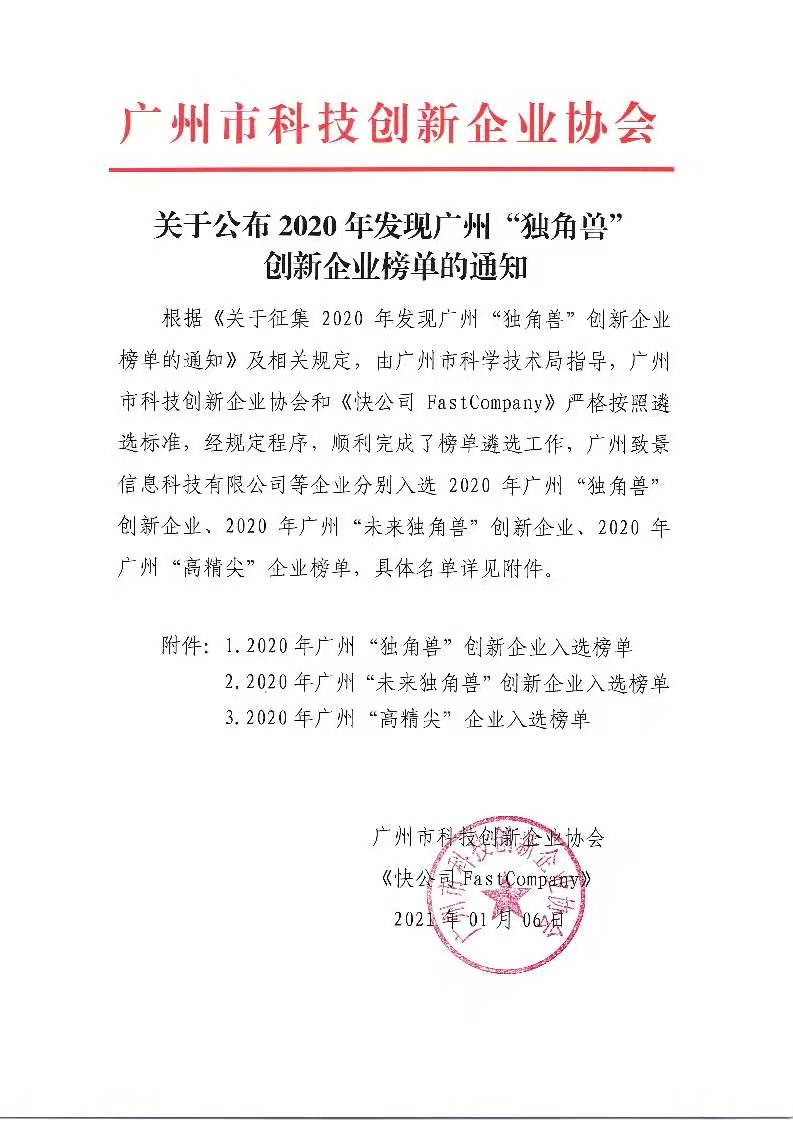 1月6日,由廣州市科學(xué)技術(shù)局指導(dǎo),廣州市科技創(chuàng)新企業(yè)協(xié)會(huì)、《快公司Fast Company》聯(lián)合發(fā)布的《2020發(fā)現(xiàn)廣州“獨(dú)角獸”創(chuàng)新企業(yè)榜單》完成公示并正式公布。云蝶科技憑借在教育科技領(lǐng)域的創(chuàng)新優(yōu)勢(shì)與發(fā)展勢(shì)頭,榮獲2020年廣州“未來獨(dú)角獸” 創(chuàng)新企業(yè)稱號(hào)。