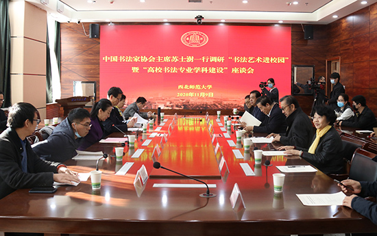 2020年11月9日,全國(guó)政協(xié)書畫室副主任、中央文史館館員、中國(guó)書法家協(xié)會(huì)主席蘇士澍,中國(guó)藝術(shù)研究院原院長(zhǎng)、中共甘肅省委原常委、宣傳部長(zhǎng)連輯,中國(guó)書法家協(xié)會(huì)會(huì)員、中央電視臺(tái)書畫家協(xié)會(huì)副主席兼秘書長(zhǎng)樓建軍,中央電視臺(tái)編導(dǎo)王淳晨,甘肅省文聯(lián)黨組成員、副主席馬青山,中國(guó)書法協(xié)會(huì)原副主席、甘肅省書法家協(xié)會(huì)名譽(yù)主席張改琴,甘肅畫院原院長(zhǎng)、省文史館館員馬國(guó)俊等一行到西北師大調(diào)研“書法藝術(shù)進(jìn)校園”暨“高校書法專業(yè)學(xué)科建設(shè)”情況,交流學(xué)校書法專業(yè)學(xué)科的建設(shè)情況,分享教師在教學(xué)、科研和創(chuàng)作上的心得和成果,共同探討書法專業(yè)在師范教育中對(duì)民族文化傳承培根鑄魂的價(jià)值和意義。