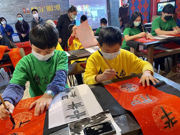 南投縣魚池小學(xué)學(xué)童完成書法春聯(lián)后,透過遠程屏幕和大陸練市小學(xué)的師生們展示,別有寓教于樂的意義。