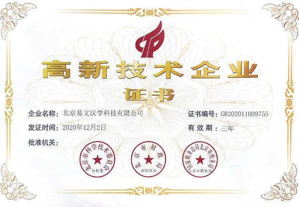 不忘初心,方得始終!新年伊始,小易收到了由北京市科學技術委員會、北京市財政局、國家稅務總局北京市稅務局聯(lián)合頒發(fā)的“高新技術企業(yè)”認證證書。這是對我們持續(xù)進行研究開發(fā)與技術成果轉化的鼓勵與認可。