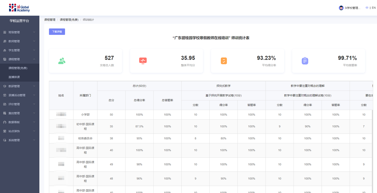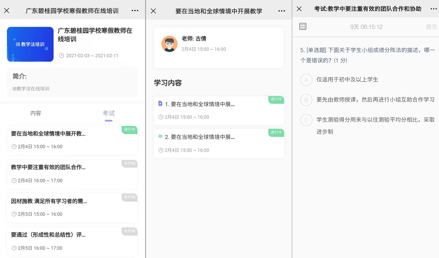 時值寒假,老師們的生活依然忙碌而充實。2月3日至2月5日,為加強教師隊伍建設,提升教育教學能力,實現創(chuàng)辦中國最好的IB國際學校的目標,廣東碧桂園學校開展寒假IB教學法教師在線培訓,來自校內幼兒園至高中,包含國內與國際部的中教老師,以及博實樂集團校下的其他兄弟學校老師,共527位參與課程學習,并以93.23%的得分率,達成了較好的培訓效果。
