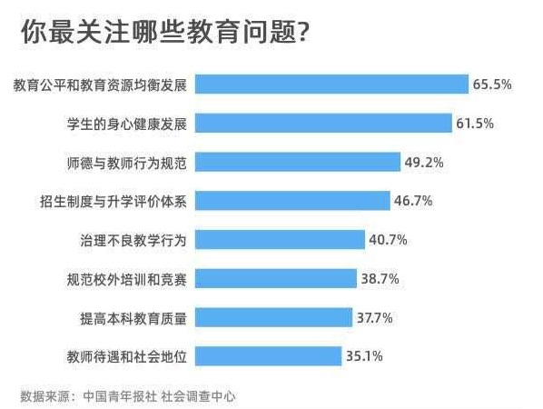 其中大家最關(guān)注的教育問(wèn)題是教育公平和教育資源均衡發(fā)展(65.5%),其次是學(xué)生的身心健康發(fā)展(61.5%)。