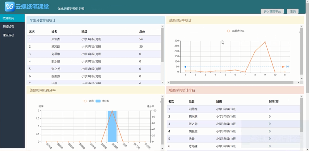 而在這堂運用了紙筆互動系統(tǒng)的數(shù)學課上,云蝶點陣數(shù)碼筆搭配印有點陣碼的課堂練習試卷,輔助老師隨時進行課堂練習。選擇題直接統(tǒng)計學生的作答情況,全班同學的答題結(jié)果、易錯項一目了然,講解更具有普遍性和針對性。