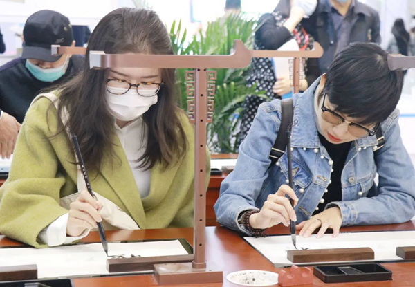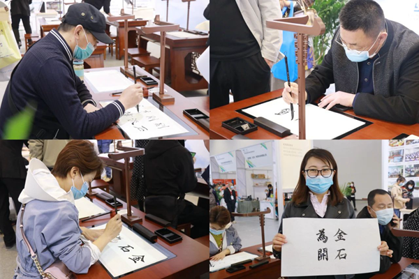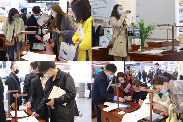 慕名而來的參觀者將華文眾合展位的氛圍一度推向高潮。參觀者或駐足觀賞或耐心聆聽或拿起毛筆寫一寫,一個個興致盎然。門庭若市的人氣、工作人員忙碌的身影、源源不斷的咨詢聲,華文眾合無疑成為這場教育裝備展示會上自帶焦點的獨特風景線。