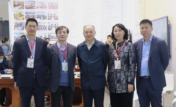 △北京市教育裝備行業(yè)協(xié)會會長柴旭津(左二)、北京市教育裝備行業(yè)協(xié)會秘書長陳謙(左三)前來參觀指導