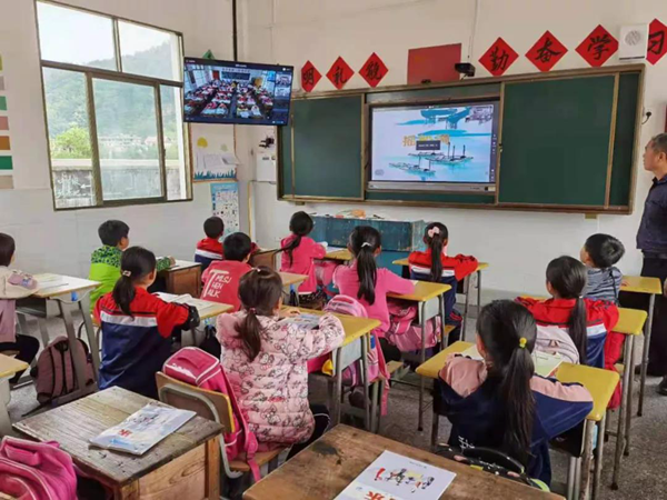 照片來自江西省興國縣,教學(xué)點(diǎn)學(xué)生正通過希沃交互智能錄播(下稱「希沃錄播」),參與中心校的一堂課。