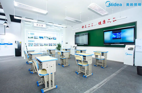 此次的教室展示區(qū)主要采用了美的照明-菱格系列LED教室燈和LED黑板燈。