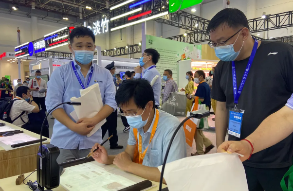 ▲翰墨派云書法教學(xué)系統(tǒng)成為最受歡迎的展項(xiàng),眾參觀者紛紛提筆體驗(yàn)