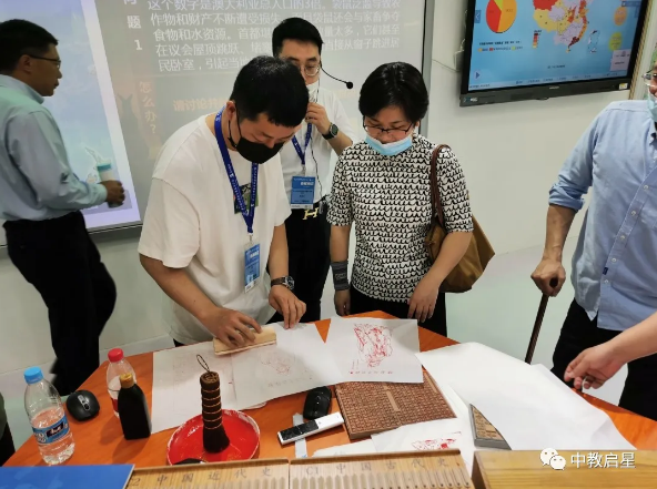 當然,明星產品數字星球系統(tǒng)、地理AR沙盤、VR教學系統(tǒng)還是參展觀眾的“心頭愛”。傳統(tǒng)文化體驗套裝更吸引了不少老師的目光,一張張地拓印著我們的雕版印刷體驗套裝,樂此不疲。