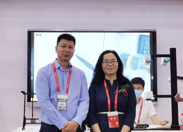 圖教育部教育裝備研究與發(fā)展中心副主任趙憲志(右二)、河南省教育技術(shù)裝備管理中心主任王德如(右一)、河南省教育裝備行業(yè)協(xié)會(huì)會(huì)長林忠培(左一)前來參觀指導(dǎo)
