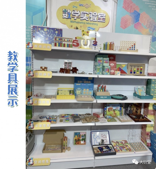 在本次大衍堂展位中,我們搭建展出了創(chuàng)新數(shù)學(xué)教育研發(fā)設(shè)計(jì)的教學(xué)產(chǎn)品和服務(wù)。從“數(shù)學(xué)實(shí)驗(yàn)室”場(chǎng)景的文化墻設(shè)計(jì)、空間營(yíng)造、掛圖和模型展示,到沙盤桌等硬件教具設(shè)施,并將課程配套學(xué)具以數(shù)學(xué)價(jià)值進(jìn)行分類展示。
