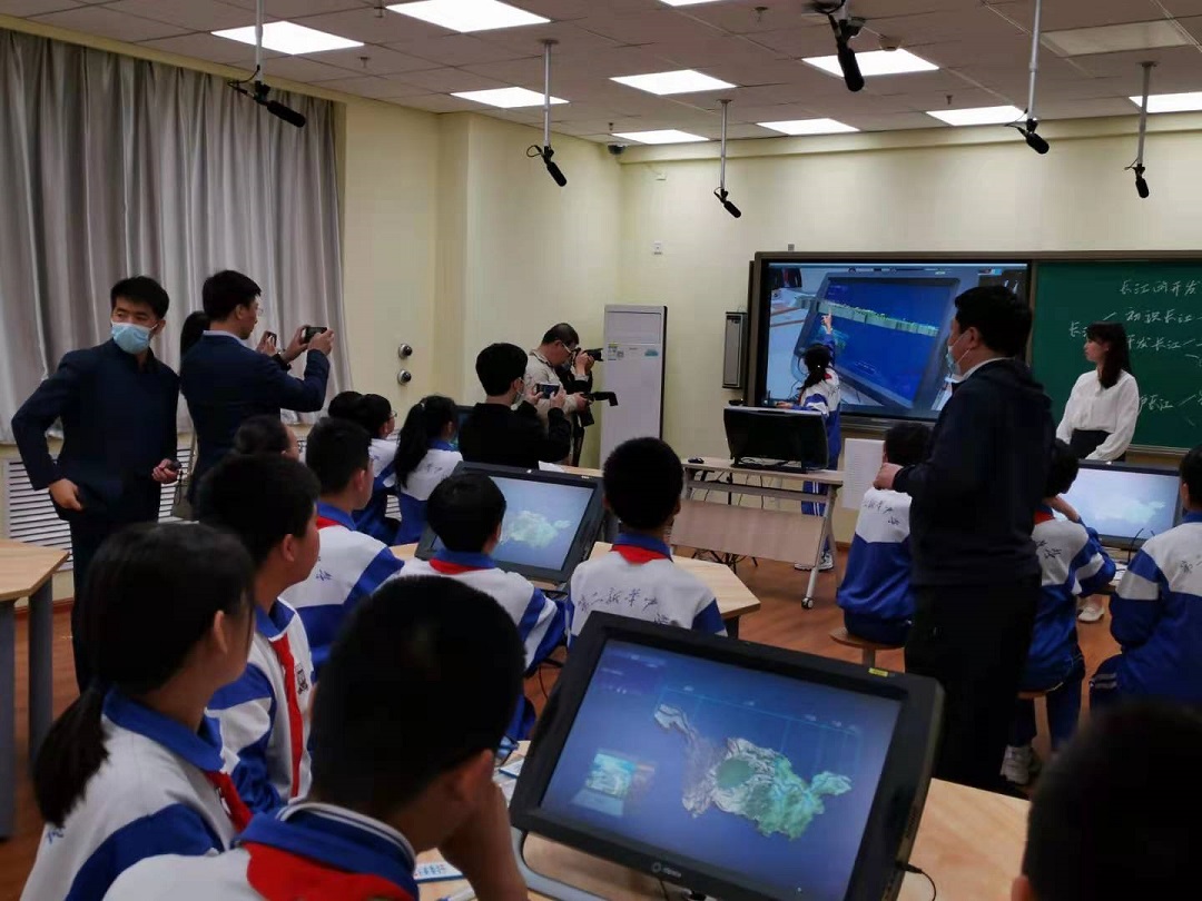 學(xué)校初中地理老師王藝涵為現(xiàn)場媒體演示了基于中教啟星研發(fā)的寰宇地理VR教學(xué)系統(tǒng)的“長江的保護(hù)和治理”課堂教學(xué)示例,引起媒體朋友的極大興趣與關(guān)注。