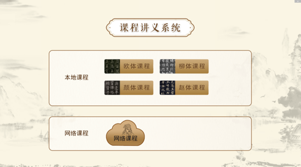 華文眾合智慧書法教學系統(tǒng)“課程”欄目,包括歐體課程、柳體課程、顏體課程、趙體課程四套本地課程以及網絡課程。課程中的視頻由當代著名書法家書寫并配有語音講解和字幕。