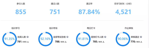 第一階段活動時間是5月16日-23日,采用“互聯(lián)網(wǎng)+線上研修”的形式進行。此次線上培訓活動以“名師課堂學習+每日小測+結(jié)營大作業(yè)”的形式,邀請老師加入指定學習社群,通過線上學習平臺,完成整個培訓學習。根據(jù)統(tǒng)計數(shù)據(jù)顯示,此次培訓在線時間長達4521小時,參與人數(shù)高達855人,培訓通過率為87.84%。