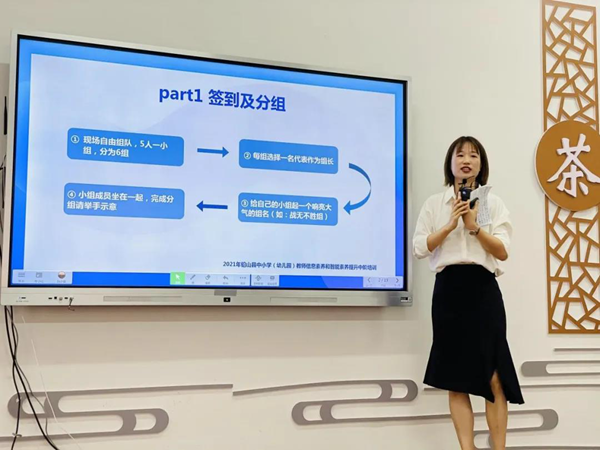 在開班儀式中,主持人陳小蝶老師通過“老師說”和“阿水的故事”兩個互動小游戲調(diào)動了全場學員的積極性,使得課堂上笑聲不斷。同時,主持人還讓學員們自行組隊選組長,并為自己小組取名。有誰說女子不如男的“木蘭組”、跨地區(qū)老師組成的“聯(lián)創(chuàng)組”、乘風破浪的“園丁組 ”、成長于沃土的“希沃之星組”。隨后,主持人讓各小組成員一一上臺展示,互相認識。