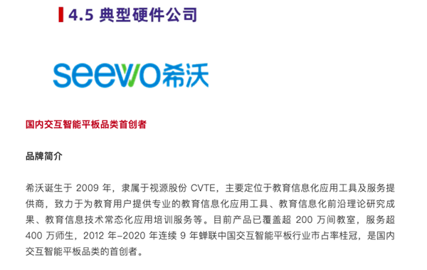 報告披露:希沃誕生于 2009 年,隸屬于視源股份 CVTE,主要定位于教育信息化應用工具及服務提供商。截至2020年12月,希沃產(chǎn)品已覆蓋超 200 萬間教室,服務千萬師生。2012 年-2020年,希沃連續(xù)9年蟬聯(lián)中國交互智能平板行業(yè)市占率桂冠*,是國內(nèi)交互智能平板品類的首創(chuàng)者。 積極拓新,希沃在保持核心產(chǎn)品既有優(yōu)勢的同時,持續(xù)深耕中小學公立校市場,積極開拓幼兒教育、高等教育、民辦教育等新市場。 同時,希沃也致力于構(gòu)建多場景解決方案:加大錄播、學生終端等各類教育信息化新產(chǎn)品的研發(fā)和運營力度,將應用軟件與數(shù)據(jù)服務進行粘合,完善品牌傳播與營銷體系,強化在新客群的品牌認知。 在服務方面,希沃持續(xù)加大服務體系建設,夯實一線區(qū)域在入校「最后一公里」的服務能力,并拓展培訓的廣度與深度,構(gòu)建以用戶為主的全面服務能力。報告表示:未來,希沃有望成為覆蓋教、學、管、評、測等全場景的最佳口碑教育科技品牌。