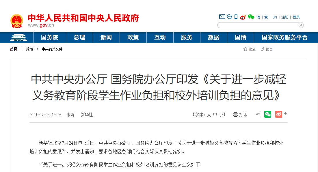 近日,中共中央辦公廳、國(guó)務(wù)院辦公廳印發(fā)了《關(guān)于進(jìn)一步減輕義務(wù)教育階段學(xué)生作業(yè)負(fù)擔(dān)和校外培訓(xùn)負(fù)擔(dān)的意見(jiàn)》,宣告“雙減”政策正式落地。