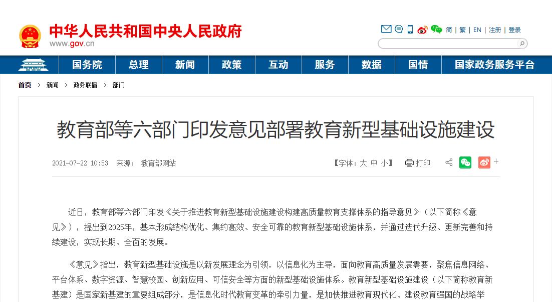 與此同時(shí),在今年七月教育部等六部門印發(fā)的《關(guān)于推進(jìn)教育新型基礎(chǔ)設(shè)施建設(shè)構(gòu)建高質(zhì)量教育支撐體系的指導(dǎo)意見(jiàn)》指出,教育新型基礎(chǔ)設(shè)施建設(shè)是國(guó)家新基建的重要組成部分,以教育新基建壯大新動(dòng)能、創(chuàng)造新供給、服務(wù)新需求,促進(jìn)線上線下教育融合發(fā)展,推動(dòng)教育數(shù)字轉(zhuǎn)型、智能升級(jí)、融合創(chuàng)新,支撐教育高質(zhì)量發(fā)展。