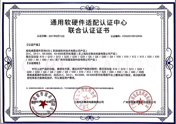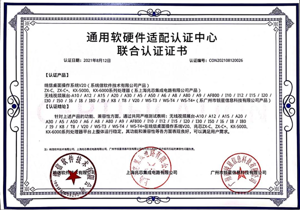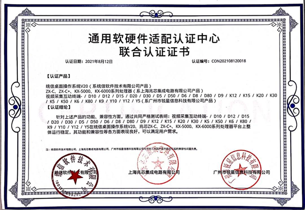 兆芯認(rèn)證證書(無線視頻展臺、視頻采集互動終端)
