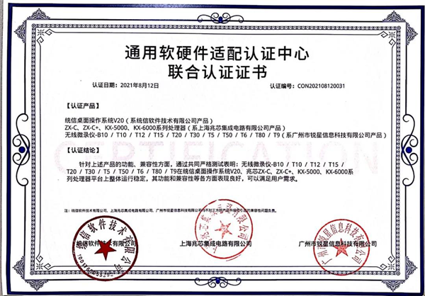 兆芯認(rèn)證證書(展示互動寶、無線微錄儀)
