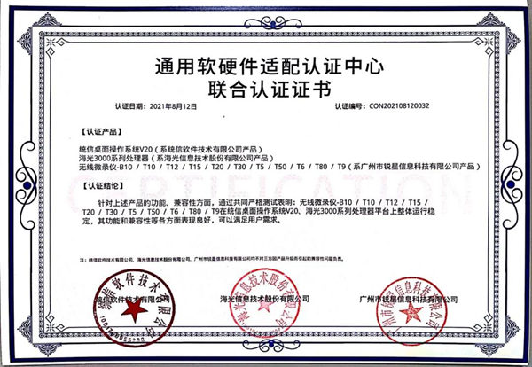 海光認(rèn)證證書(展示互動寶、無線微錄儀)