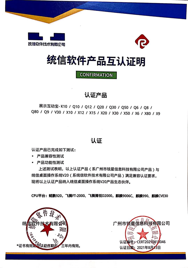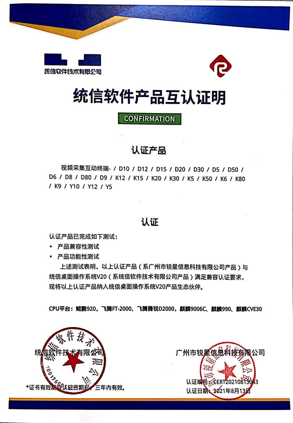 統(tǒng)信認(rèn)證證書(展示互動寶、無線微錄儀)