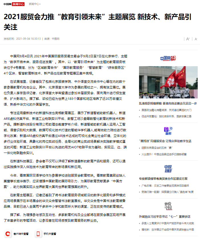 歷時6天的2021中國國際服務貿(mào)易交易會(簡稱“服貿(mào)會”)于9月7日在北京閉幕。以“教育引領(lǐng)未來”為主題的教育專題展區(qū)收獲多家媒體的報道和觀眾的關(guān)注。其中作為服貿(mào)會教育專題展區(qū)中唯一一家“傳統(tǒng)與科技相結(jié)合”“弘揚中國書法文化”的智慧書法教育裝備企業(yè),華文眾合智慧書法教室憑借先進的理念使中國傳統(tǒng)書法在服貿(mào)會這一國際舞臺之上大放異彩。下面就跟隨各大媒體鏡頭,看一看華文眾合在服貿(mào)會上的精彩表現(xiàn)吧!