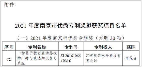 江蘇歐帝提交的“一種基于教室互動黑板的廣播與快速知識復(fù)習(xí)系統(tǒng)”(201610664708.6)參加南京市優(yōu)秀專利獎申報項目,經(jīng)過評比,該專利獲得2021年度南京市優(yōu)秀發(fā)明獎。
