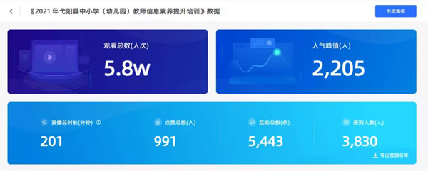 8月24日線上培訓(xùn)正式開始,培訓(xùn)第一階段為線上直播課,課程涵蓋了希沃白板交互式課件制作、班級(jí)優(yōu)化大師智能班級(jí)管理、新型微課知識(shí)膠囊制作三部分內(nèi)容,旨在使老師們掌握互動(dòng)課件制作、班級(jí)管理軟件應(yīng)用以及微課錄制的方法,從而提升教師信息化素養(yǎng)。線上直播課觀看人次累計(jì)5.8w,互動(dòng)次數(shù)達(dá)5543次,同時(shí)在線老師人數(shù)高達(dá)2205人。直播效果顯著,真正將“足不出戶就能享受教育培訓(xùn)資源”落實(shí)到位。