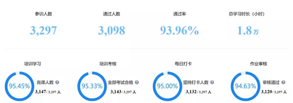 而接下來的線上研修課程分為了7天去完成,共涵蓋47節(jié)課程。全縣共有3147名教師完成了全部課程的學(xué)習(xí),總學(xué)習(xí)時(shí)長1.8w小時(shí),課程完成率達(dá)到95.45%。第三階段,在課程最后的7天提交大作業(yè)環(huán)節(jié),培訓(xùn)通過率也達(dá)到了93.96%。此次線上培訓(xùn)活動(dòng)效果顯著,提高了教師學(xué)習(xí)的積極性。
