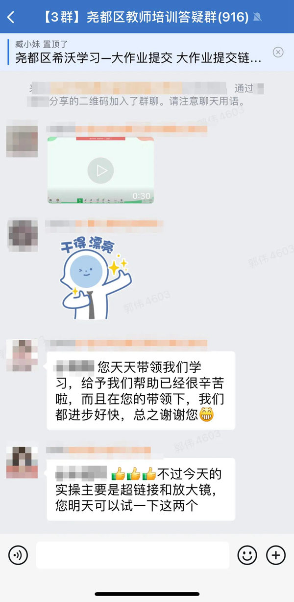 針對(duì)本次培訓(xùn),堯都區(qū)教育局組建了“堯都區(qū)教師培訓(xùn)交流群”,由希沃邀請(qǐng)一線信息技術(shù)名師入群進(jìn)行培訓(xùn)答疑。一線信息技術(shù)名師在群內(nèi)的互動(dòng),進(jìn)一步點(diǎn)燃老師們的學(xué)習(xí)熱情,參訓(xùn)老師紛紛分享自己制作的互動(dòng)式課件,利用蒙層、課堂獎(jiǎng)勵(lì)、學(xué)科工具、課堂互動(dòng)等功能變革知識(shí)點(diǎn)的各種呈現(xiàn)方式,琢磨功能的刪減……在這個(gè)過(guò)程中,大家熱烈積極的交流氛圍將培訓(xùn)推至高潮。